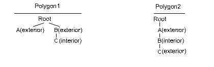 Los objetos de polígono mantienen una estructura de árbol para realizar un seguimiento de los contornos e identificar los niveles de anidamiento. El ejemplo siguiente muestra las distintas estructuras de árbol de las dos figuras anteriores. El primer árbol de polígono contiene dos ramas, mientras que el segundo tiene solo una.