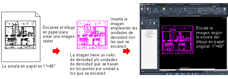 La imagen del siguiente ejemplo se dibujó en una escala papel de 1" = 48", se exploró a 300 puntos por pulgada y, a continuación, se insertó en un dibujo utilizando 300 como valor de densidad y pulgadas como unidades de densidad. Por consiguiente, se escaló en función de su escala papel: 1" = 48".