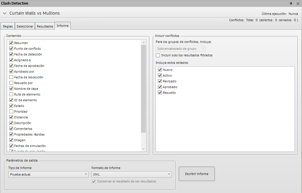La ficha Informe permite configurar y generar informes con los datos de todos resultados de conflictos detectados en la prueba seleccionada.