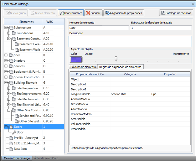 Al realizar la medición de un modelo, Quantification extrae los datos de diseño incrustados y los asigna automáticamente a los elementos en el catálogo. Cada tipo de elemento (por ejemplo, línea, área o volumen) se asigna a la propiedad de objeto por defecto correspondiente. Por ejemplo, los elementos lineales se asignan por defecto a Longitud, los elementos de área se asignan a Área y así sucesivamente. Esta es la propiedad que se mide durante la medición.