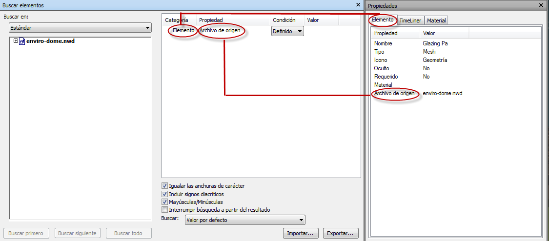 Una parte esencial de este proceso es localizar los elementos con las propiedades específicas del modelo en la ventana Buscar elementos, exportar dichas propiedades a un archivo XML y modificarlas para asignarlas a la propiedad de mediciones que haya elegido. Puede resultar útil ver las ventanas Buscar elementos y Propiedades en paralelo: