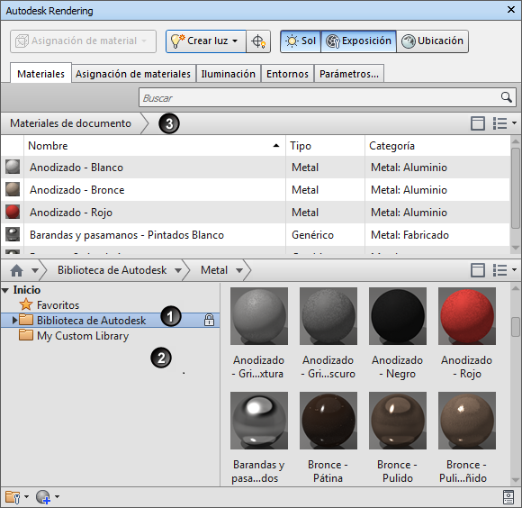 1 - Biblioteca de Autodesk. Contiene los materiales predefinidos para su uso en aplicaciones de Autodesk que admiten materiales. Las bibliotecas que proporciona Autodesk están bloqueadas, como indica el icono de bloqueo. Aunque no se puede editar la biblioteca de Autodesk, se pueden utilizar estos materiales como base para materiales personalizados que se pueden guardar en la biblioteca de usuario.