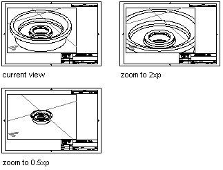 The following illustrations show the view of the model at a scale of 1:1, and then the same model view show at scales of 2:1 and 1:2. A scale of 2:1 increases the view of the model to twice the size of the paper space units; while a scale of 1:2 displays the model at half its actual size.