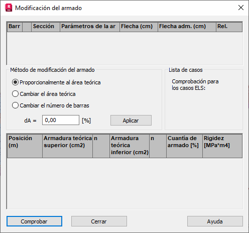 Haga clic en Modificación del armado en el cuadro de diálogo Informe de los cálculos de las barras de hormigón armado para abrir el cuadro de diálogo Modificación del armado. Esto permite la corrección semiautomática del armado calculado en elementos para los que se ha superado la flecha admisible.