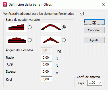 Utilice esta opción para definir parámetros para la verificación adicional de las barras flexionadas. Para acceder a esta opción, haga clic en el botón Otros del cuadro de diálogo Definición de la barra - parámetros. Se abre el cuadro de diálogo siguiente: