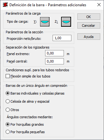 Al seleccionar una opción de este campo, puede definir una función de barras de un único ángulo en una estructura y cómo se conectan con cartelas. En función de la opción seleccionada, Robot calcula la esbeltez equivalente del elemento en compresión según la sección 13.3.3. Por lo tanto, la esbeltez calculada se utilizará la comprobación de pandeo de las direcciones Y y Z.