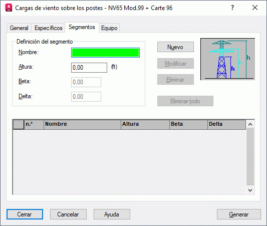 Al abrir el cuadro de diálogo Cargas de viento sobre los postes y hacer clic en la ficha Segmentos, se muestra el siguiente cuadro de diálogo: