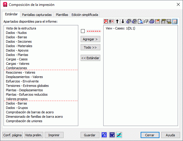 El cuadro de diálogo se divide en el panel izquierdo y el derecho. El panel izquierdo presenta los objetos seleccionados para la impresión (en función de la ficha seleccionada). El panel derecho incluye una impresión completa que puede contener todos los objetos especificados en el panel izquierdo. Para preparar la composición de la impresión, desplace objetos del panel izquierdo al derecho mediante los botones Todo y Agregar. La opción Todo desplaza todos los objetos disponibles a la derecha. La opción Agregar desplaza solo los objetos seleccionados (resaltados). Haga clic en el botón Estándar para que la composición de la configuración actual sea una impresión estándar. Todos los componentes de impresión incluidos en el panel derecho se transferirán al panel izquierdo de la ficha Estándar.