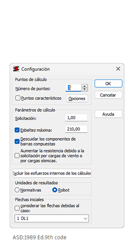 Utilice el cuadro de diálogo Configuración para definir los parámetros aplicados durante la verificación de una barra de acero según la norma estadounidense seleccionada. Para acceder al cuadro de diálogo, haga clic en el botón Configuración del cuadro de diálogo Cálculos. Se abre el cuadro de diálogo siguiente: