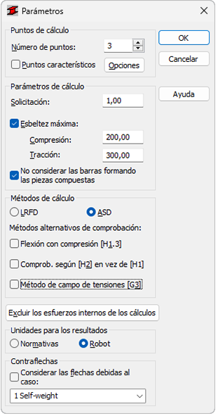 Si la opción Aumentar la resistencia debido a la solicitación por cargas de viento o por cargas sísmicas está seleccionada, la resistencia del material se aumenta automáticamente 1/3 según la sección A5.2 de la norma para casos sísmicos y de viento sencillos, así como para combinaciones que incluyan estos casos.