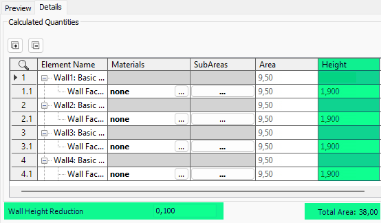 (Calculate Room Quantities) para abrir el cuadro de diálogo Calculate Room Quantities. Seleccione una superficie de muro de la estructura de árbol y busque la opción Wall Height Reduction en la parte inferior del cuadro de diálogo.