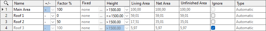 - Roof 3: esta opción informa de los datos de subáreas para el área sobre la línea de altura de 2,00 m. El área se añade al área para vivienda. Esta área se ha establecido por defecto en Ignore, por lo que es de solo lectura en este cuadro de diálogo. Por lo tanto, el valor de subárea se resta del área principal y el resultado se calcula correctamente en la etiqueta de habitación. Al resumir el área de habitación neta de las subáreas, puede ver que el resultado de la NRA se corresponde con el área principal.