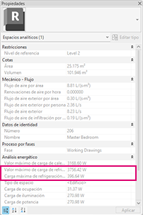 Además del informe que se genera tras un análisis, las demandas máximas de flujo de aire, refrigeración y calefacción se establecen también como propiedades en cada espacio analítico. En el ejemplo siguiente, se muestra la misma carga de refrigeración que la resaltada en la sección del informe mostrada anteriormente.