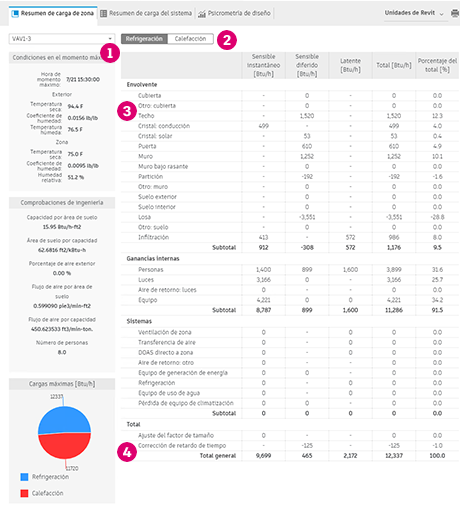 . El total general muestra la carga total sensible (diferida e instantánea), total latente y total para su uso en el ajuste de tamaño de componentes