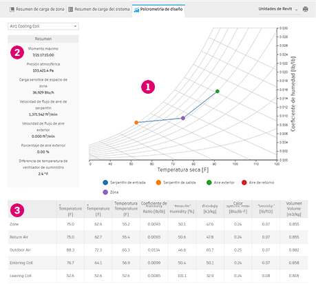 Utilice el informe Psicrometría de diseño para ver el ciclo psicrométrico del aire a través del sistema y evaluar si se trata del ciclo previsto. En el informe, se muestran diversas propiedades físicas y termodinámicas del aire a una presión constante para ayudar con la resolución de problemas.