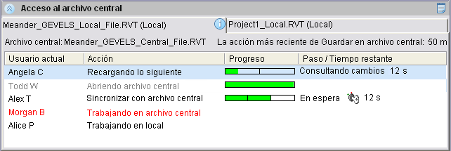 Para determinar quién está trabajando en el mismo proyecto que el usuario, consulte el panel Acceso al archivo central en Worksharing Monitor