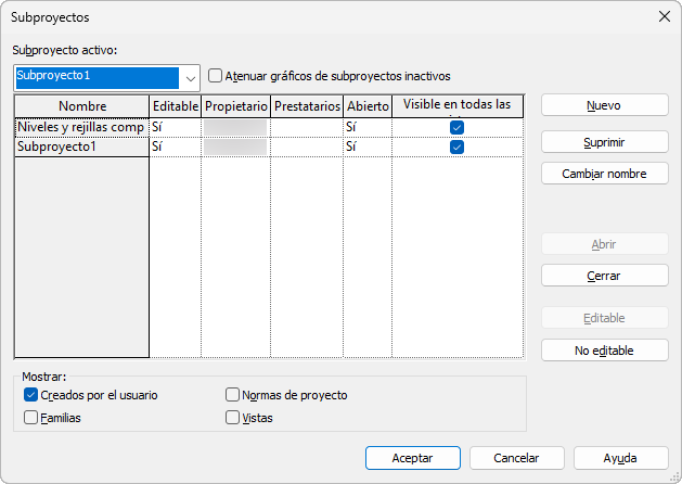 La imagen siguiente muestra el cuadro de diálogo Subproyectos, con los dos subproyectos creados por defecto por el usuario: Niveles y rejillas compartidos y Subproyecto1.
