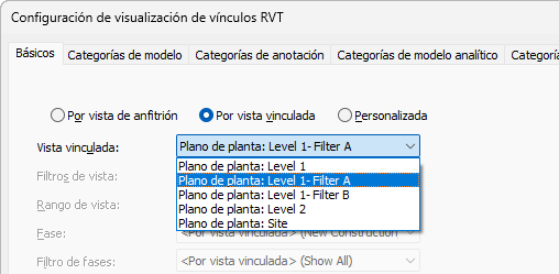 - Para Vista vinculada, seleccione la vista del modelo vinculado cuya configuración de visualización desea utilizar para el modelo vinculado en la vista de anfitrión actual.