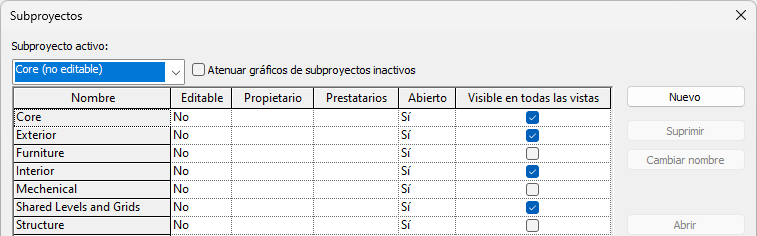 Al crear un subproyecto, utilice la opción Visible en todas las vistas del cuadro de diálogo Nuevo subproyecto para indicar si ese subproyecto se debe mostrar en todas las vistas del modelo. Este parámetro se refleja en la columna Visible en todas las vistas, en el cuadro de diálogo Subproyectos.