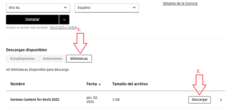 Seleccione el contenido que desea descargar e instalar para el software Revit.