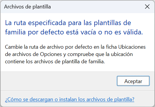 Aviso: Si se eliminan los paquetes de contenido esenciales, Revit puede mostrar el siguiente mensaje porque no se han encontrado plantillas de familia en la ruta de plantilla de familia especificada en el archivo Revit.ini.