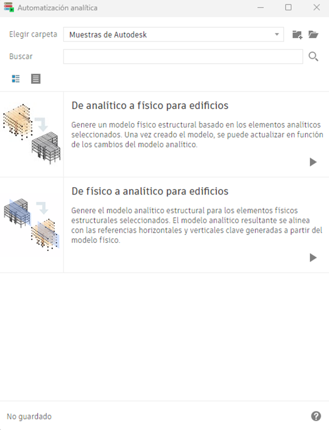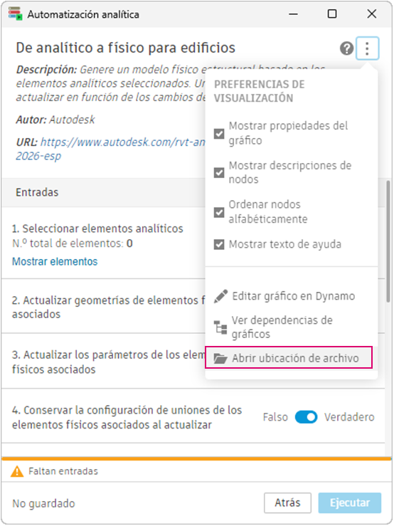 Puede encontrar el archivo de Dynamo para cada opción. Para ello, abra Personalización de la automatización en la ficha Analizar