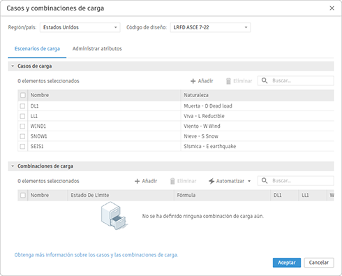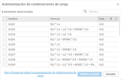 Puede utilizar el generador Automatizar combinación de carga en función de la región o el país y la norma de diseño seleccionados.
