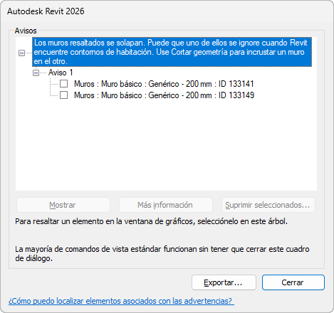 Expanda los elementos para ver los elementos individuales asociados a cada aviso. Al seleccionar el texto que se encuentra cerca del aviso, el elemento se resalta en todas las vistas abiertas en las que se muestre.