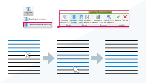 Divida uno o varios conjuntos de armaduras en la posición de la barra seleccionada o en la referencia de línea de intersección.