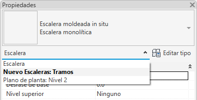 - Si lo desea, puede especificar las propiedades de ejemplar del tramo, como Altura de base relativa y las preferencias Empezar con contrahuella/Terminar con contrahuella. En la paleta Propiedades, seleccione Nueva escalera: Tramos y modifique las propiedades de ejemplar como sea necesario. Consulte Propiedades de ejemplar de componentes de tramo.