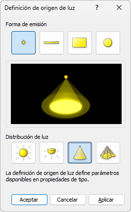 4. En Forma de emisión, seleccione la forma de la luz que se va a emitir desde el origen de luz: Punto, Línea, Rectángulo o Círculo.