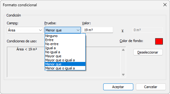 El formato condicional se puede utilizar, para definir condiciones que señalen, por ejemplo, si un área tiene una superficie cuadrada menor que un valor determinado o si las habitaciones de un modelo están recibiendo la cantidad correcta de flujo de aire.