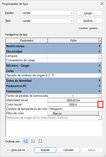 Al vincular estos parámetros y añadir una lámpara de araña a un modelo de construcción, en el proyecto puede ajustar el parámetro Intensidad inicial (u otros parámetros vinculados) para toda la lámpara de araña. No es posible cambiar la Intensidad inicial de cada vela de la lámpara de araña.