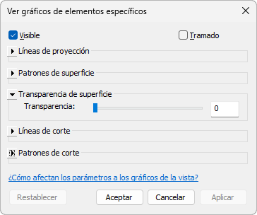 En el cuadro de diálogo Gráficos de elementos específicos de vista, se muestra la configuración actual de visualización de gráficos y visibilidad del elemento. Expanda cada sección para ver sus parámetros.