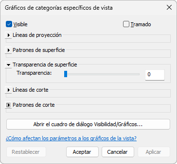 En el cuadro de diálogo Gráficos de categorías específicos de vista, se muestra la configuración actual de visualización de gráficos y visibilidad de la categoría seleccionada. Expanda cada sección para ver sus parámetros.