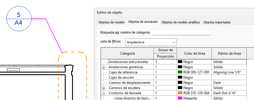 Puede controlar el color, patrón y grosor de línea que se utilizan para burbujas de llamada y líneas directrices. La configuración que especifique aquí se aplicará a todas las llamadas del proyecto.