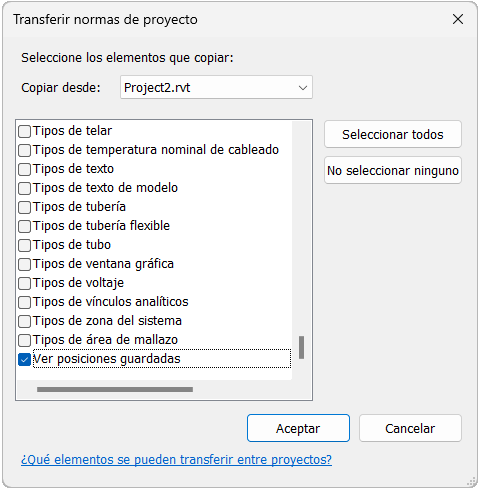 Las posiciones guardadas se pueden transferir entre modelos mediante Transferir normas de proyecto