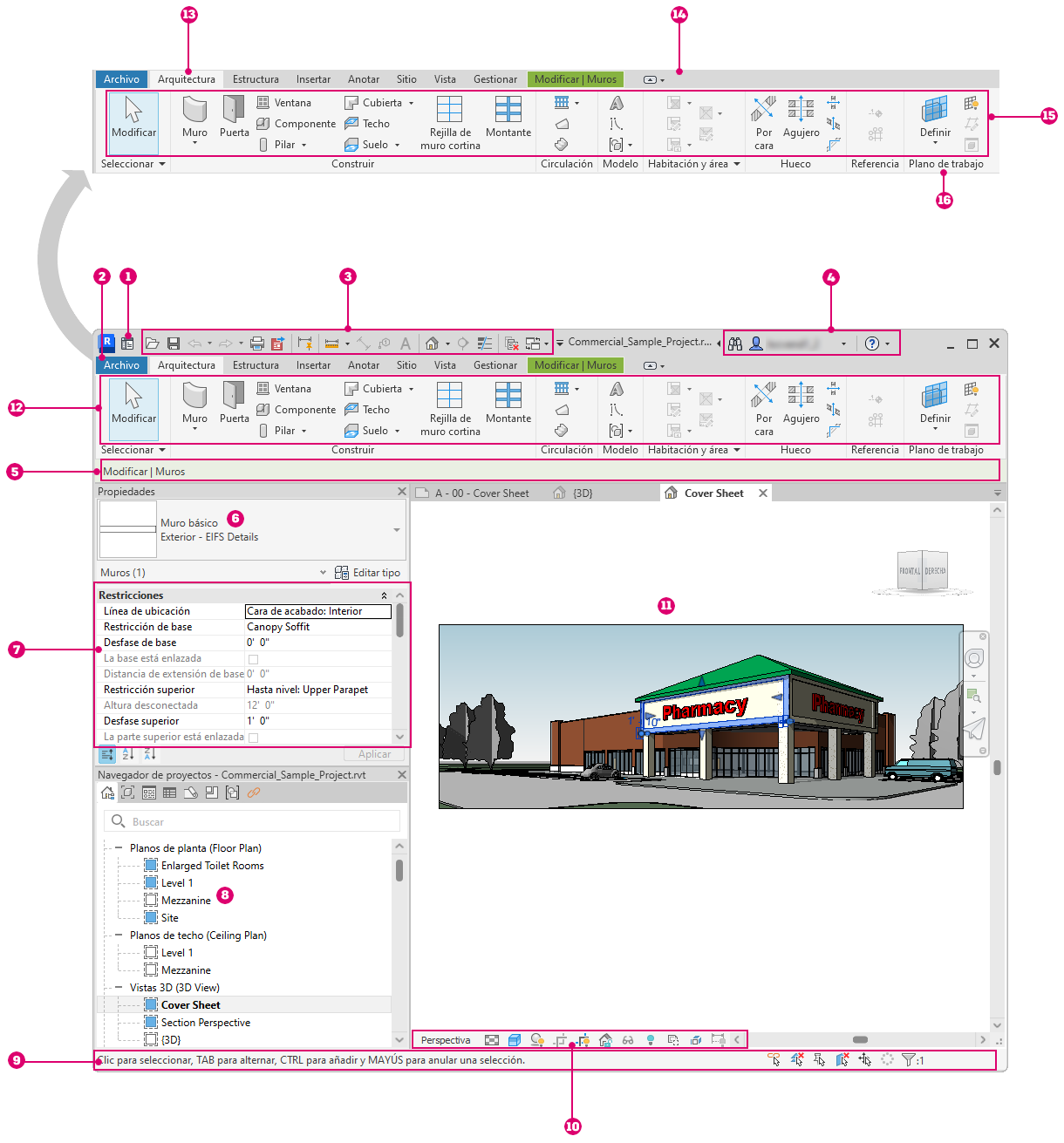 | 14 | Una ficha contextual de la cinta de opciones, que proporciona herramientas relevantes para el objeto seleccionado o la acción actual |
