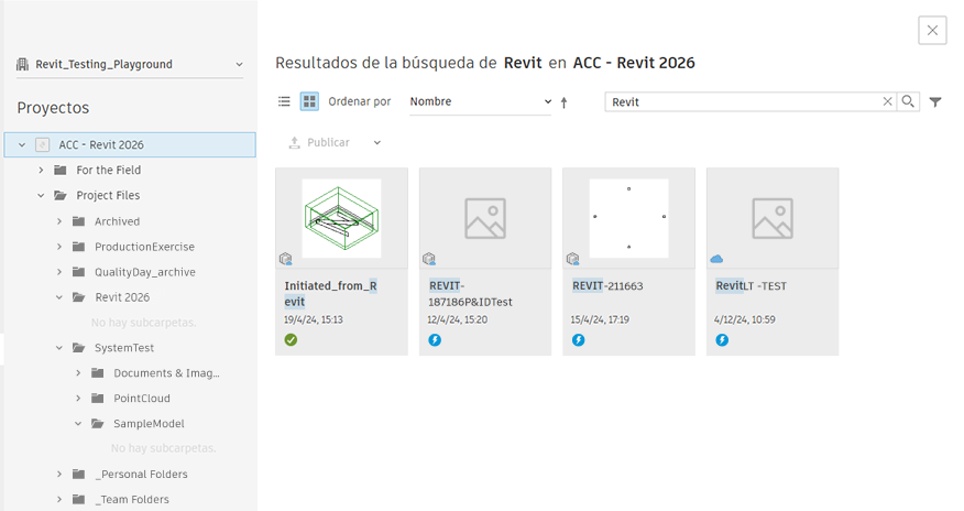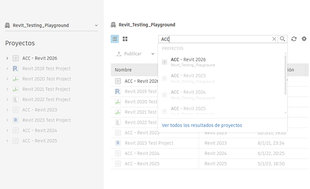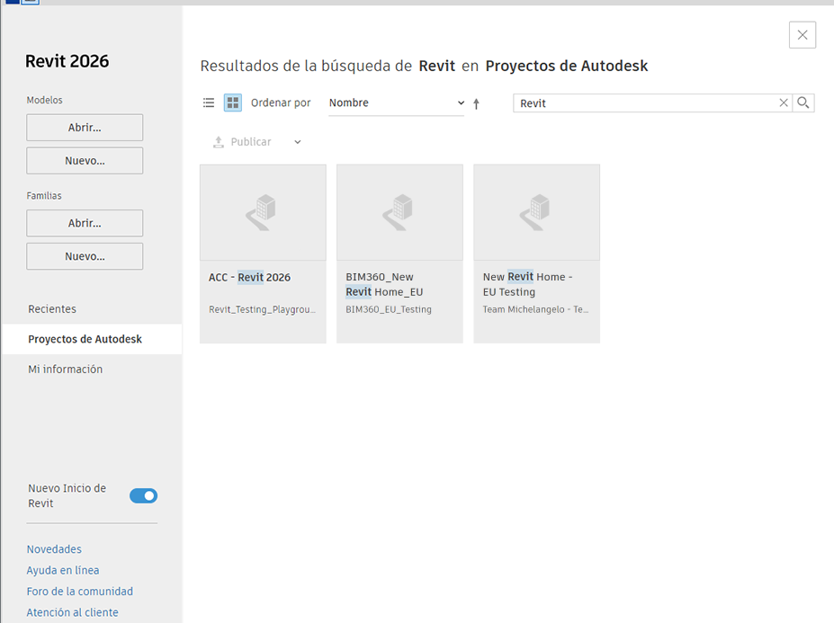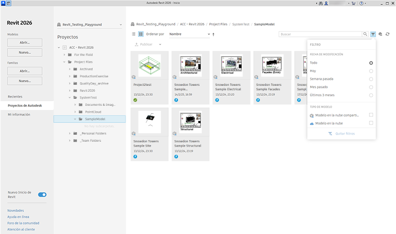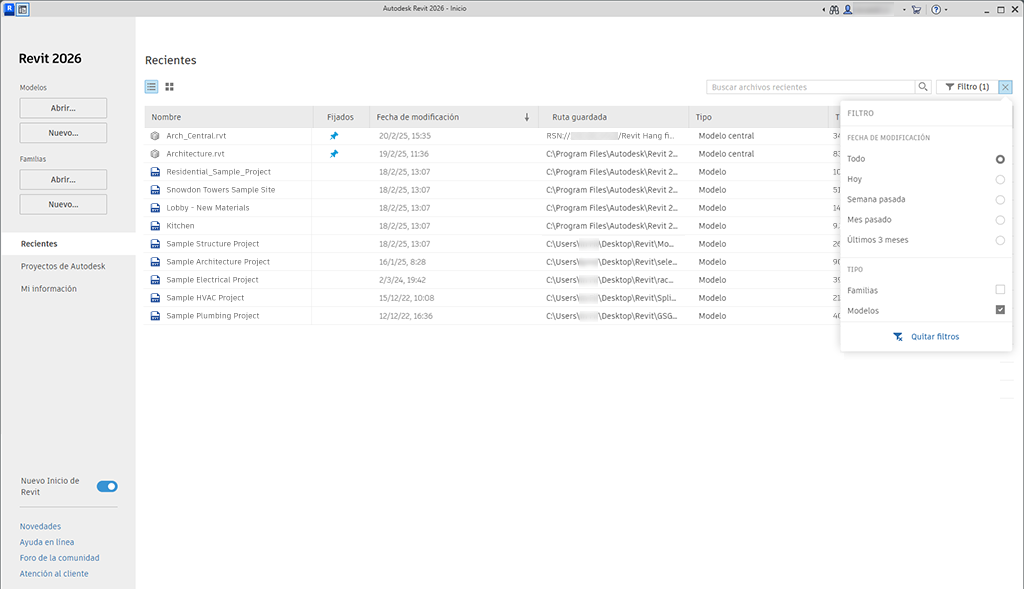 - Busque archivos y proyectos, y filtre por fecha de modificación (Todo, Hoy, La semana pasada, El mes pasado, Últimos 3 meses) y tipo (Familias y Modelos).