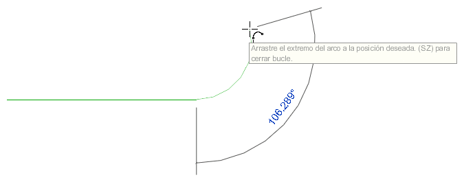 Para especificar un arco por inicio-fin-radio, dibuje una cuerda que conecte los dos extremos del arco y, a continuación, especifique el ángulo o el radio con el tercer punto.