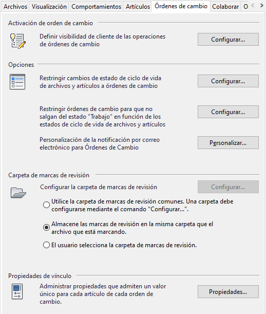 La ficha Órdenes de cambio contiene opciones para restringir los cambios de artículos a las órdenes de cambio en función del estado del ciclo de vida o el estado, configurar la carpeta de marcas de revisión, administrar propiedades de vínculos de órdenes de cambio y definir esquemas de numeración de orden de cambio. También puede desactivar la operación Órdenes de cambio.