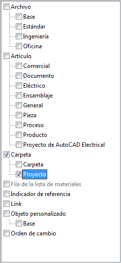 Carpeta | Utilice la carpeta asociación para crear una propiedad personalizada. La propiedad personalizada se puede restringir a una carpeta subclase, como una carpeta o proyecto. |