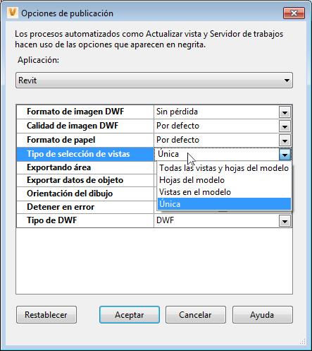 Modo de publicación | Permite especificar el modo que se utilizará para publicar el archivo DWF. |