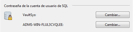 Cuando Vault está instalado, se proporcionarán contraseñas por defecto para las cuentas de servicio de VaultSys y ADMS_%SiteName% SQL El administrador puede cambiar estas contraseñas para que sean más seguras.