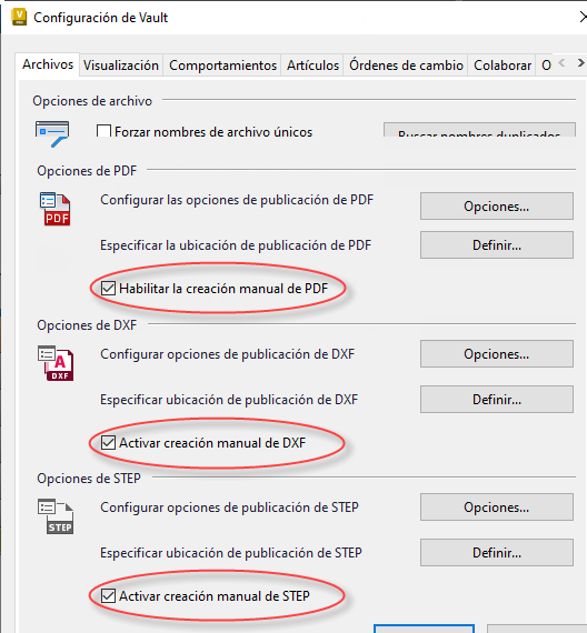 Nota: Como administrador, debe activar la casilla de verificación de creación de archivos en la sección Opciones de DXF, PDF y STEP del cuadro de diálogo Configuración de Vault para utilizar la función Crear archivo.