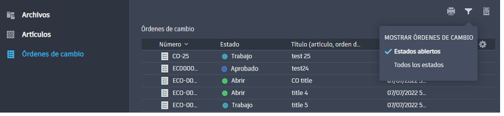 Seleccione el filtro "Estados abiertos" o "Todos los estados". Si se selecciona Estados abiertos, todas las órdenes de cambio en estado Cerrada o Cancelada se ocultarán de la vista.