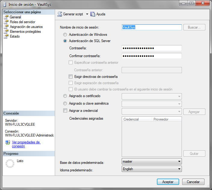 Escriba VaultSys como nombre de inicio de sesión.