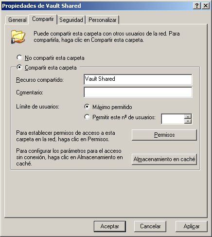 En el campo Comentario, escriba Carpeta de red compartida para Autodesk Vault.
