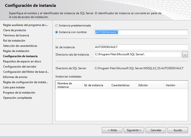 En la ventana Configuración de instancias, seleccione Instancia con nombre y escriba el nombre. Puede utilizar "AutodeskVault", por ejemplo, o especificar su propio nombre de instancia.