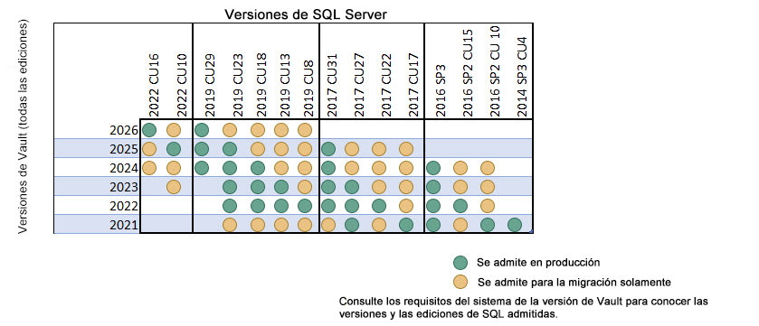 En la siguiente tabla se resumen las versiones compatibles de Vault y SQL con puntos de color verde. Los puntos de color amarillo son la ruta de actualización recomendada. Consulte Requisitos del sistema de Vault para su versión de Vault a fin de garantizar la compatibilidad entre versiones del producto Vault y SQL.